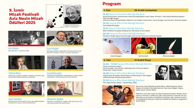 Efes Selçuk Belediyesi’nin ev sahipliğinde, Kültürlerarası Sanat Derneği ve Nesin Vakfı iş birliğiyle bu yıl dokuzuncusu düzenlenecek olan İzmir Uluslararası Mizah Festivali 20–23 Aralık tarihleri arasında başlıyor.