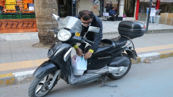 İzmir'de yaşayan Erhan Önel, yeni tip koronavirüs (Kovid-19) nedeniyle sokağa çıkması kısıtlanan 65 yaş ve üstü ile hastalarla engellilerin alışverişini motosikletiyle yapıp, maske ve eldiven gibi koruyucu önlemler aldıktan sonra adreslere teslim ediyor.