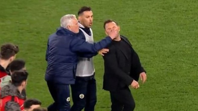 Jose Mourinho, maçtan sonrası Okan Buruk'un burnunu sıktı. Buruk, müdahalenin ardından yerde kaldı.