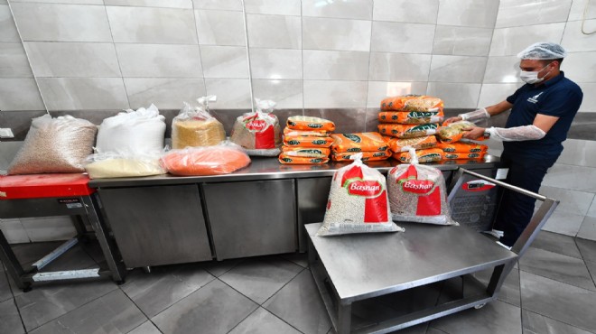 İzmir Büyükşehir Belediyesi Sosyal Hizmetler Dairesi Başkanlığı Aşevleri Şube Müdürlüğü ekiplerine ait araçlarla ulaştırılan kolilerde kuru fasulye, nohut, yeşil mercimek, barbunya, kırmızı mercimek, pirinç, bulgur, arpa şehriye, erişte ve makarna bulunuyor.