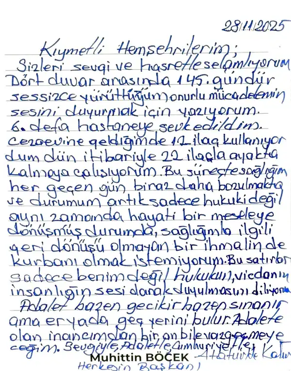 Bu süreçte sağlığım her geçen gün biraz daha bozulmakta ve durumum artık sadece hukuki değil, aynı zamanda hayati bir meseleye dönüşmüş durumda. Sağlığımla ilgili geri dönüşü olmayan bir ihmalin de kurbanı olmak istemiyorum.