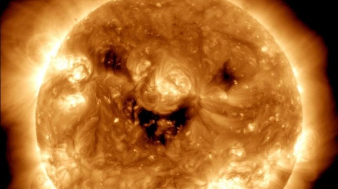 Bugün, NASA'nın Solar Dynamics Observatory uydusu, 'gülümseyen' Güneş'i yakaladı. Morötesi ışıkta görülen Güneş üzerindeki bu koyu lekeler, koronal delikler olarak bilinir ve hızlı güneş rüzgarının uzaya saçıldığı bölgelerdir."
