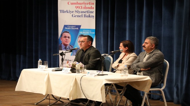 Söyleşide ilk sözü alan usta gazeteci Deniz Zeyrek, Cumhuriyetin kazanımlarını korumaları gerektiğini ifade etti. Zeyrek, “Kars’ın Kazım Karabekir Öğretmen Lisesi’nde okuyan bir öğretmen çocuğuydum. Çok önemli okullarda okuyan insanlarla birlikte aynı sınava girdik ve onlarla rekabet edilme fırsatı bulduk. Cumhuriyet bize fırsat eşitliği, sosyal adalet kattı. Çoban Sülü’nün yani Süleyman Demirel’in Cumhurbaşkanı olduğu bir atmosferde yetiştik. Cumhuriyet, bizleri kul olmaktan çıkarıp eşit birer yurttaş haline getirdi” dedi. Cumhuriyetin, demokrasinin olmazsa olmazı olduğu söyleyen Zeyrek, “Dünyada birçok ülke Cumhuriyet rejimi ile yönetiliyor. Ama demokrasi olmadan Cumhuriyet bir işe yaramıyor. Demokrasinin en önemli özelliği seçimle değiştirilebilmesidir. Cumhuriyetin ikinci yüzyılına girerken Türkiye seçime gidiyor. Cumhuriyetimizin bize sunduğu imkânları kaybetmek istemeyen bazı insanlar ve onların çabası var, ben bu çabaların çok önemli olduğunu düşünüyorum. İktidarlar için en tehlikeli duygu karşı tarafta büyüyen umuttur, çünkü umut bulaşıcıdır ve cesareti tetikler. Mustafa Kemal Atatürk’ün dişiyle tırnağıyla kazıya kazıya ülkemizin temellerine koyduğu o ilkelere sahip çıkmamız gerekiyor” dedi.