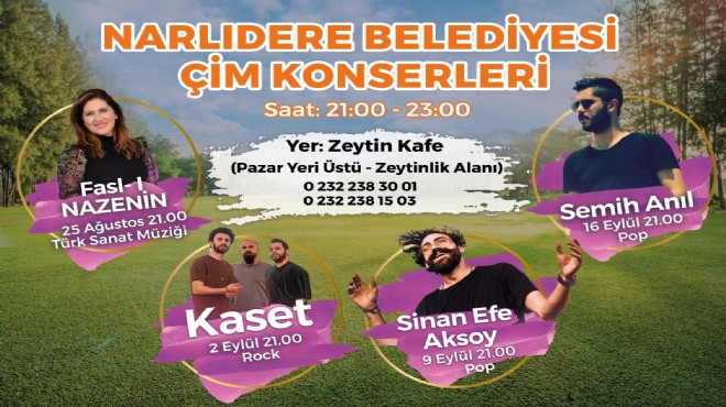 Narlıdere Belediyesi’nin bu yıl ilk kez düzenleyeceği Çim Konserleri, pazar yerinin üst kısmındaki zeytinlik alanda yeni yapılan Zeytin Kafe’nin bahçe alanında 21.00- 23.00 saatleri arasında yapılacak. İlk konser 25 Ağustos Çarşamba günü (yarın) gerçekleşecek ve Türk Sanat Müziğinin sevilen ismi Fasl-ı Nazenin sahne alacak. 2 Eylül Perşembe günü Kaset grubu rock konseri verecek. 9 Eylül Perşembe günü pop müziğinin sevilen sesi Sinan Efe Aksoy sahne alacak. 16 Eylül’de de Semih Anıl çim konserlerinin kapanışını yapacak.