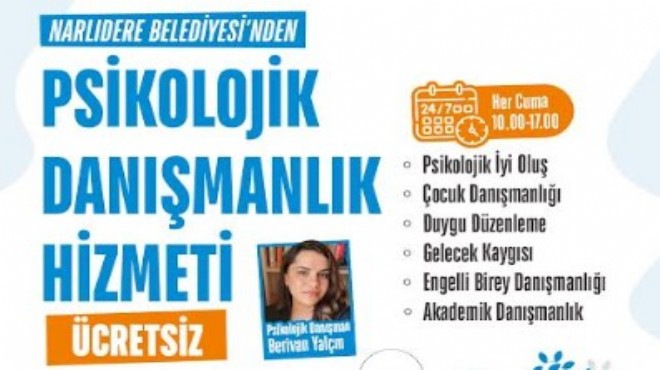Narlıdere Belediyesi, Pakize Ateş Kadın Danışma Merkezi bünyesinde verdiği, psikolojik danışmanlık hizmetiyle, ilçede yaşayan vatandaşlara ücretsiz psikolojik destek sağlıyor. Bireylerin ruh sağlığını desteklemek amacıyla, haftanın bir günü halkla buluşturulan psikolojik danışmanlık hizmeti; stres ve kaygı gibi sorunlarla karşı karşıya kalanların zor günlerinde yanında oluyor. Vatandaşların duygusal ve zihinsel sağlıklarını güçlendirme fırsatı veren psikolojik danışma hizmetinden faydalanmak isteyenlerin Pakize Ateş Kadın Danışma Merkezi’ne gelerek ya da 0 232 239 73 00 numaralı telefondan randevu almaları gerekiyor.