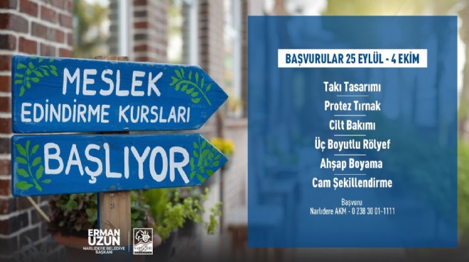 Kurslara katılmak isteyen vatandaşların, başvurularını 25 Eylül 2024 ile 4 Ekim 2024 tarihleri arasında Narlıdere Atatürk Kültür Merkezi’nde (AKM) yapması gerekiyor. Narlıdere AKM ve Narlıdere Halk Eğitim Merkezi atölyelerinde hafta içi gerçekleşmesi planlanan kursların sonunda katılımcılara sertifika da verilecek.