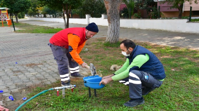 Narlıdere Belediyesi, pandemi koşullarından etkilenen sahipsiz hayvanlar için, ilçedeki pek çok park ve sokağa su kabı yerleştirdi.