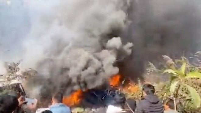 Devlet televizyonunun yayımladığı görüntülerde, Himalaya Dağları'nın eteğindeki sarp bölgede düşen uçaktan alev ve dumanın çıkması yer aldı.