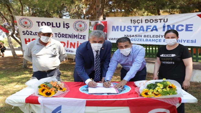Güzelbahçe Belediyesi 41 memur, 65 kadrolu ve 204 şirket çalışanını kapsayan toplu iş sözleşmesine imza attı. KHK ile Belediye bünyesine alınan 204 işçi sendikalı oldu. Gerçekleştirilen imza törenine, Güzelbahçe Belediye Başkan Mustafa İnce, CHP Güzelbahçe İlçe Başkanı Çağlayan Bilgen, Belediye Meclis üyeleri, TümBel-Sen 2 Nolu Şube Başkanı Fatma Kılınç, Belediye İş Sendikası 4’Nolu Şube Başkanı Ayhan Doğan, sendika yöneticileri ve belediye çalışanları katıldı.