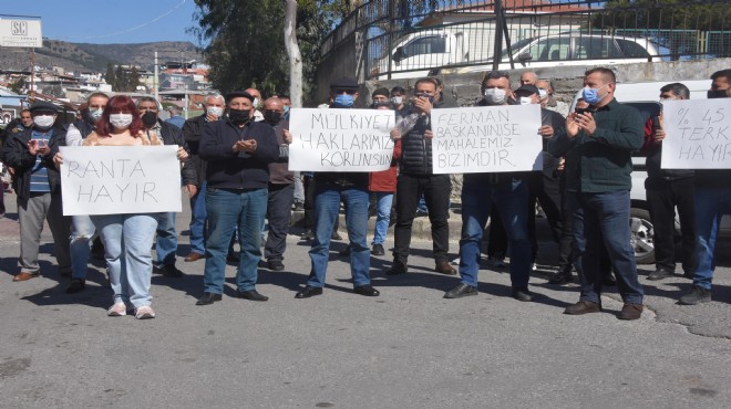 Cumhuriyet Mahallesi Muhtarı Özay Dağhan, Karşıyaka Belediye Başkanı Cemil Tugay'ın kendilerine verdiği sözü tutmadığını savundu. Dağhan, "Askı süreci başladığında hem İzmir Büyükşehir Belediye Başkanı Tunç Soyer hem de Karşıyaka Belediye Başkanı Cemil Tugay, imara itiraz edeceğimizi söylediğimizde yanımızda olduklarını söylediler. Bunun üzerine itirazlarımızı yaptık. Tugay ile makamında bir kez daha görüştüğümüzde bize söz vermişti. Ancak ne olduysa sözünü tutmadı. Yüzde 45 sosyal donatı payına itiraz ediyoruz. 100 metrekare yeri olan birinin, yüzde 45'i direkt alınıyor ve üç katlı evi olan vatandaşa iki artı bir bile ev düşmüyor. Ancak belediyeye ait olan taşınmazlar korunuyor. Kendi taşınmazlarını koruyup, halkın arsalarını gasbediyorlar" dedi.