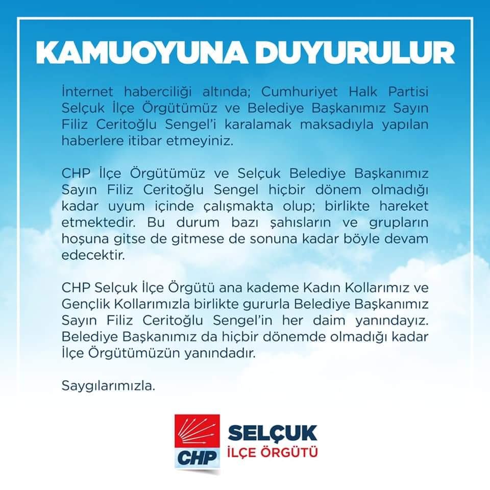 GERÇEKİZMİR - Cumhuriyet Halk Partisi (CHP) Selçuk İlçe Örgütü’nden ‘Kamuoyuna Duyurulur’ başlığı altında açıklama yapıldı.