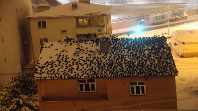 Çatılar ve ağaçlar kargalardan görünmez oldu. Kar yağışı ile birlikte ortaya çıkan kargalar, gün doğana kadar kentin üzerinde gürültülü bir şekilde uçtu.