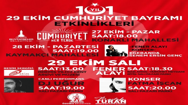 29 Ekim Cumhuriyetimizin 101. yılı tüm yurtta olduğu gibi Ödemiş’te de organize edilen etkinliklerle kutlanacak. 27 Ekim Pazar günü İzmir Büyükşehir Belediyesi’nin “Cumhuriyet Her Yerde” sloganıyla yapılacak ilk etkinlik Konaklı Mahallesi’nde 18:00-20:00 saatleri arasında gerçekleşecek. Çocuklara yönelik oyun grupları ve aktivitelerin yer aldığı program da Levent Üzümcü ile söyleşi düzenlenecek.