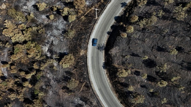 Sarp arazide, yoğun çam ormanlarının yanı sıra zeytin bahçelerinin de bulunduğu bölgede, yangın sonrası yeşil alanların siyaha büründüğü görüldü.