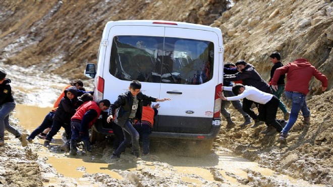 Öğrenciler, yer yer dizlerine kadar ulaşan çamurun içerisine girip, servis araçlarını itiyor.