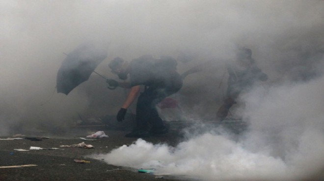Polisin, biber gazı ve göz yaşartıcı gaz kullanarak protestocuları hükümet binasından uzaklaştırmaya çalıştığı, buna karşılık şemsiye ve koruyucu gözlük kullanan göstericilerin birlikte tezahürat yapıp aynı anda adımlayarak polisi aşmaya çalıştıkları kaydedildi.
