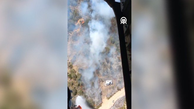 İhbar üzerine bölgeye İzmir Orman Bölge Müdürlüğüne bağlı 2 uçak, 3 helikopter, 12 arazöz, 4 su ikmal aracı ve dozer sevk edildi. (AA)