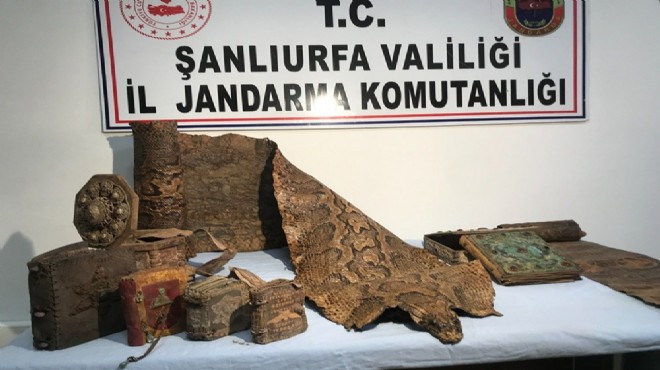Şanlıurfa'da, Ortaçağ'dan kalma olduğu değerlendirilen ve üzerine figürlerin işlendiği piton derisi ile çeşitli dini kitaplar ele geçirildi.