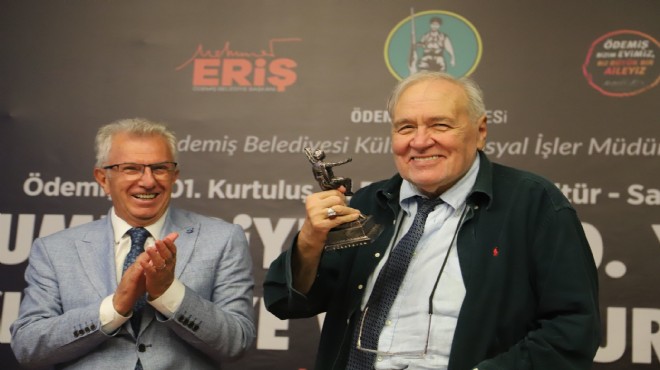 Söyleşi sonrası Ödemiş Belediye Başkanı Mehmet Eriş, Prof. Dr. İlber Ortaylı’ya günün anısı olarak efe heykeli takdim etti.