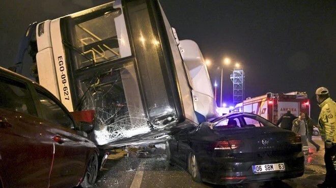 Alınan bilgiye göre, 515 hat numaralı Fatih-Sıhhiye seferini yapan Fikret Özbek idaresindeki 06 BS 9537 plakalı otobüs, Yenimahalle Rajiv Gandhi Caddesi'nde sürücüsünün direksiyon hakimiyetini kaybetmesi sonucu karşı şeride geçerek, trafik ışığında bekleyen otomobillerin üzerine devrildi.