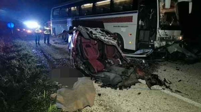 Karşı şeride geçen otomobil, Onur Gürsoy (37) yönetimindeki servis otobüsü ile kafa kafaya çarpıştı. Çarpışmanın etkisiyle ikiye bölünen otomobilin sürücü Sönmez ile yanında bulunan Fatih Akyol (22) yola fırladı.