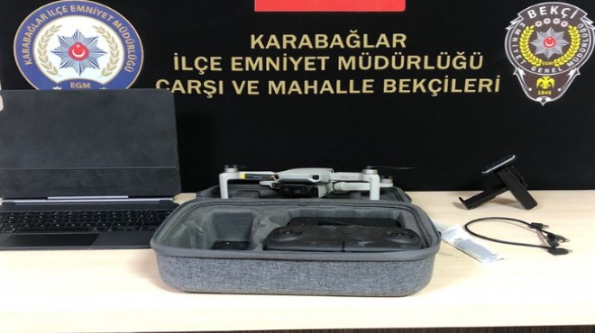 Şüphelinin elindeki poşette yapılan incelemede, dron ve parçaları, garaj anahtarı, klavye ve kaşe tespit edildi.
