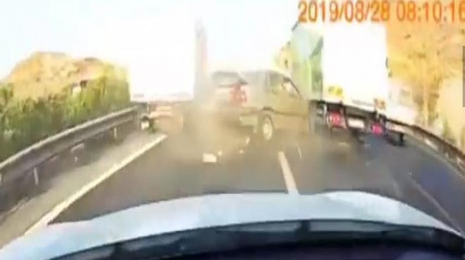 Ölen ya da yaralananın olmadığı kaza anı başka bir aracın kamerası tarafından görüntülendi. Görüntülerde, iki kamyonet arasında sıkışan otomobilin sürücüsünün kazadan önce tehlikeyi sezip, sağ şeride geçmek istediği ancak başaramadığı, sonrasında da aracından çıkıp, panik halinde telefonuna sarıldığı görülüyor. (DHA)