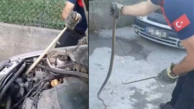 İhbar üzerine itfaiye ekibi bölgeye sevk edildi. Otomobilin motor kısmına saklanan yılanı tespit eden ekipler çalışma başlattı. Boyu yaklaşık 2 metre olan yılan saklandığı yerden çıkarılarak doğaya salındı. (DHA)