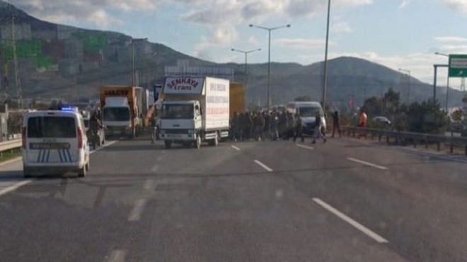 İzmir-Aydın Otoyolu'nda bir araya gelen çok sayıda kamyon sürücüsü, bir süre yolu trafiğe kapattı.