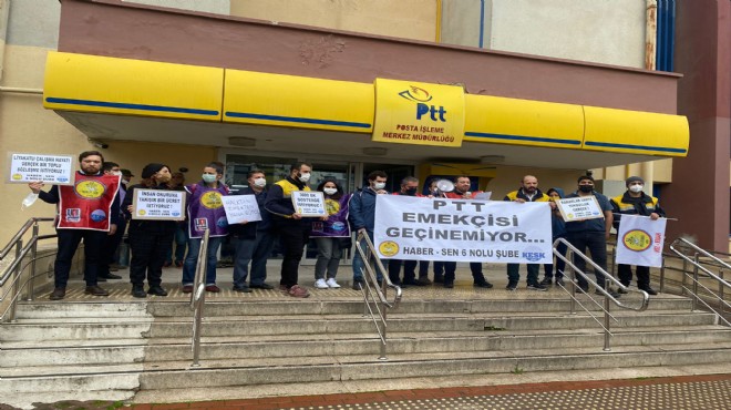 GERÇEKİZMİR -Basın Yayın İletişim ve Posta Emekçileri Sendikası(Haber-Sen) 6 Nolu şubesi İzmir Posta İşletme Merkez Müdürlüğü önünde bir basın açıklaması gerçekleştirdi. Yurt genelinde düzenlenen eylemlerin İzmir ayağında ‘PTT emekçisi geçinemiyor…’ pankartı altında toplanan PTT çalışanları neredeyse her kalemde gelen zamlarla birlikte PTT çalışanlarının geçinemediğini vurgularken asgari ücretin de alım gücü göz önüne alındığında yeterli olmadığı belirtildi.