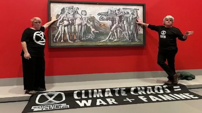 Extinction Rebellion (Yok oluş isyanı) isimli iklim protesto grubundan iki savunucu, paha biçilemez bir sanat eserine ellerini yapıştırdı.