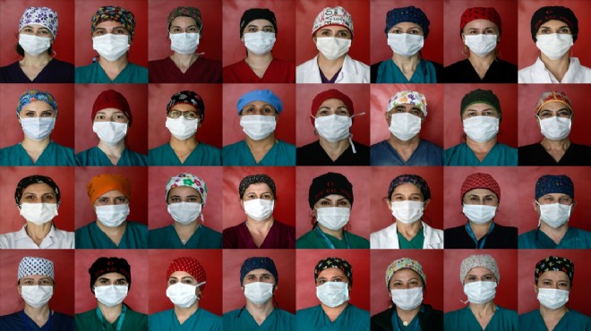 Yeni tip koronavirüsle (Kovid-19) mücadelede fedakarca görev yapan sağlık çalışanları, hijyen amaçlı başına taktıkları bez boneleriyle dikkati çekiyor.