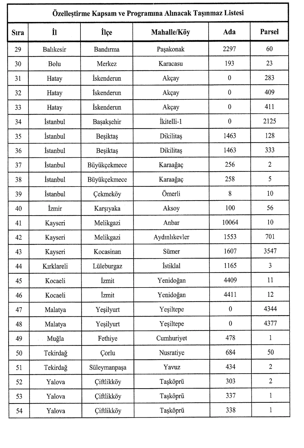 Cumhurbaşkanı kararıyla, mülkiyeti Maliye Hazinesi adına kayıtlı 54 taşınmaz ve üzerlerindeki yapılar özelleştirme kapsam ve programına dahil edildi. Karara göre söz konusu taşınmazlar; satış, kiralama, gelir ortaklığı modeli ya da işletme hakkının devri gibi yöntemlerle değerlendirilebilecek.