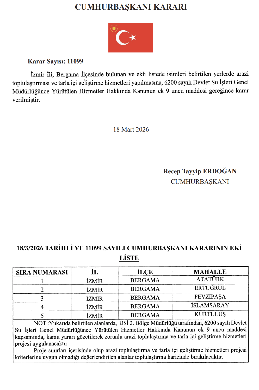 Resmi Gazete’de yayımlanan Cumhurbaşkanı kararıyla İzmir’in Bergama ilçesindeki 5 mahallede arazi toplulaştırma ve tarla içi geliştirme çalışması yapılacak. Proje DSİ tarafından yürütülecek.