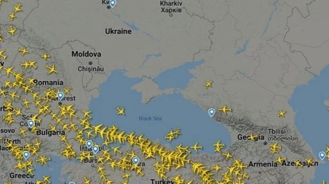 Rusya’nın askeri operasyon sinyallerinin güçlenmesinin ardından sivil uçaklar, Türk hava sahasına yöneldi ve Ukrayna hava sahası tamamen boşaldı. Uçuş radar kayıtları, Karadeniz Kuzeyi’ndeki tüm uçuşların Türk hava sahasına yöneldiğini gösteriyor.