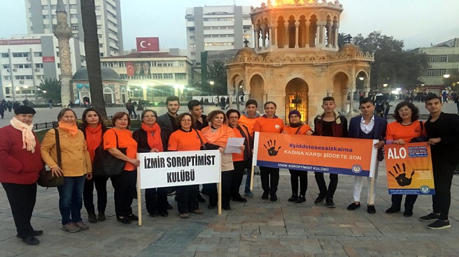 ?Kadına yönelik şiddetin ölenmesi, kadının sosyal ve ekonomik kalkınması konularında da çalışan İzmir Soroptimist Kulübü, 25 Kasım Kadına Yönelik Şiddete Karşı Mücadele ve Uluslararası Dayanışma Günü nedeniyle İzmir Büyükşehir Belediyesi ile yaptığı görüşme sonunda İzmir Saat Kulesi'nin 25 Kasım'dan itibaren 10 Aralık'a kadar şiddetle mücadelenin sembol rengi olan turuncu ile aydınlatılmasını sağladı. 25 Kasım akşamı İzmir Saat Kulesi Birleşmiş Milletler'in mücadele rengi olarak belirlediği turuncu renkle ışıklandırıldı, kadınlar turuncu kıyafet giydi ve boyunlarına şal taktı, "Kadına şiddete son" diyerek, slogan attı. (DHA)