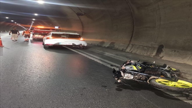 Alınan bilgiye göre, tünelde İzmir yönüne ilerleyen Alican İnce (27) yönetimindeki 45 AGD 381 plakalı motosiklet, tünel içinde önünde ilerleyen Sedat Toktamış yönetimindeki 34 EEL 805 plakalı otomobile arkadan çarptı.