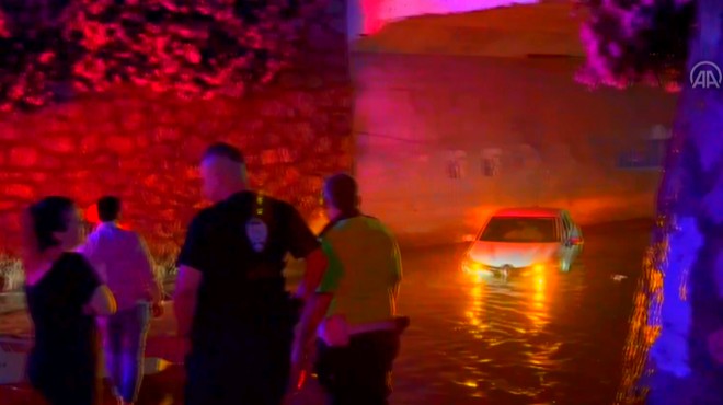 İzmir'in Kemalpaşa ilçesinde, sağanak nedeniyle suyla dolan alt geçitte bir araç mahsur kaldı.