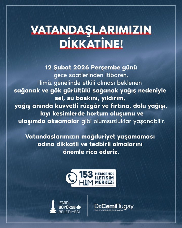 GERÇEKİZMİR - İzmir Büyükşehir Belediyesi, 12 Şubat 2026 Perşembe gecesinden itibaren kent genelinde etkili olması beklenen sağanak ve gök gürültülü sağanak yağışlara karşı vatandaşları uyardı.