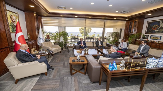 TÜRK-İŞ’e bağlı Sağlık İşçileri Sendikası Genel Başkan Yardımcısı Adem Sarıçoban ve İzmir şube yöneticileri İzmir Büyükşehir Belediye Başkanı Tunç Soyer’i ziyaret etti. Koronavirüs sürecinde başta ücretsiz ulaşım olmak üzere sağlık çalışanlarına verdiği destekten ötürü Başkan Soyer’e teşekkür plaketi sunan Sarıçoban, “Bizler düşük ücretle çalışan sağlık emekçileriyiz. Ücretsiz ulaşım demek sağlık çalışanlarımızın çocuklarına daha çok süt alması, evine gıda yardımı demek. Verilen destekler bizi çok mutlu etti” diye konuştu.