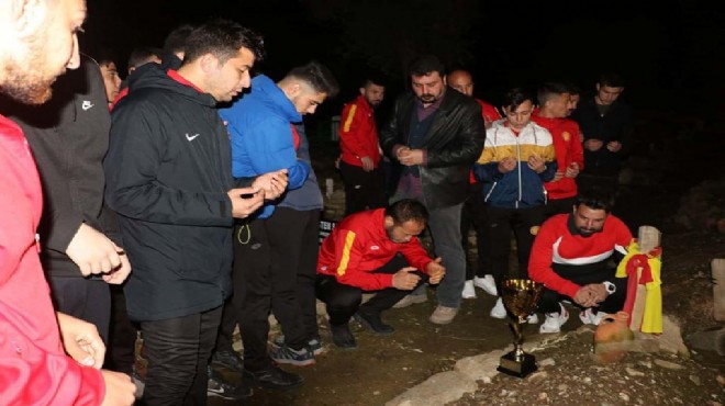 Süper Amatör Lig'e yükselen Tire Belediyespor'da futbolcular final maçının dönüşünde şampiyonluk kupasını sezon başında kaybettikleri malzemeci Mustafa Güngör'ün mezarına götürdü.