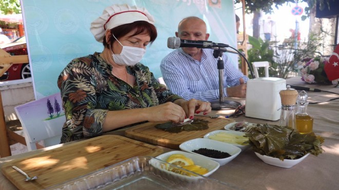 Söyleşide bulunan Karaburun Belediye Başkanı İlkay Girgin Erdoğan, dinleyenlere hoş bir sürpriz yaparak, asma yaprağında sardalyeyi elleriyle sarararak vatandaşlara ikram etti.