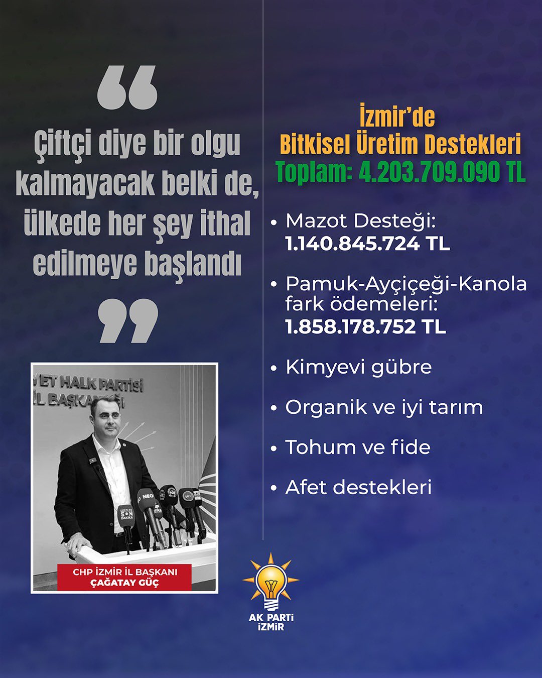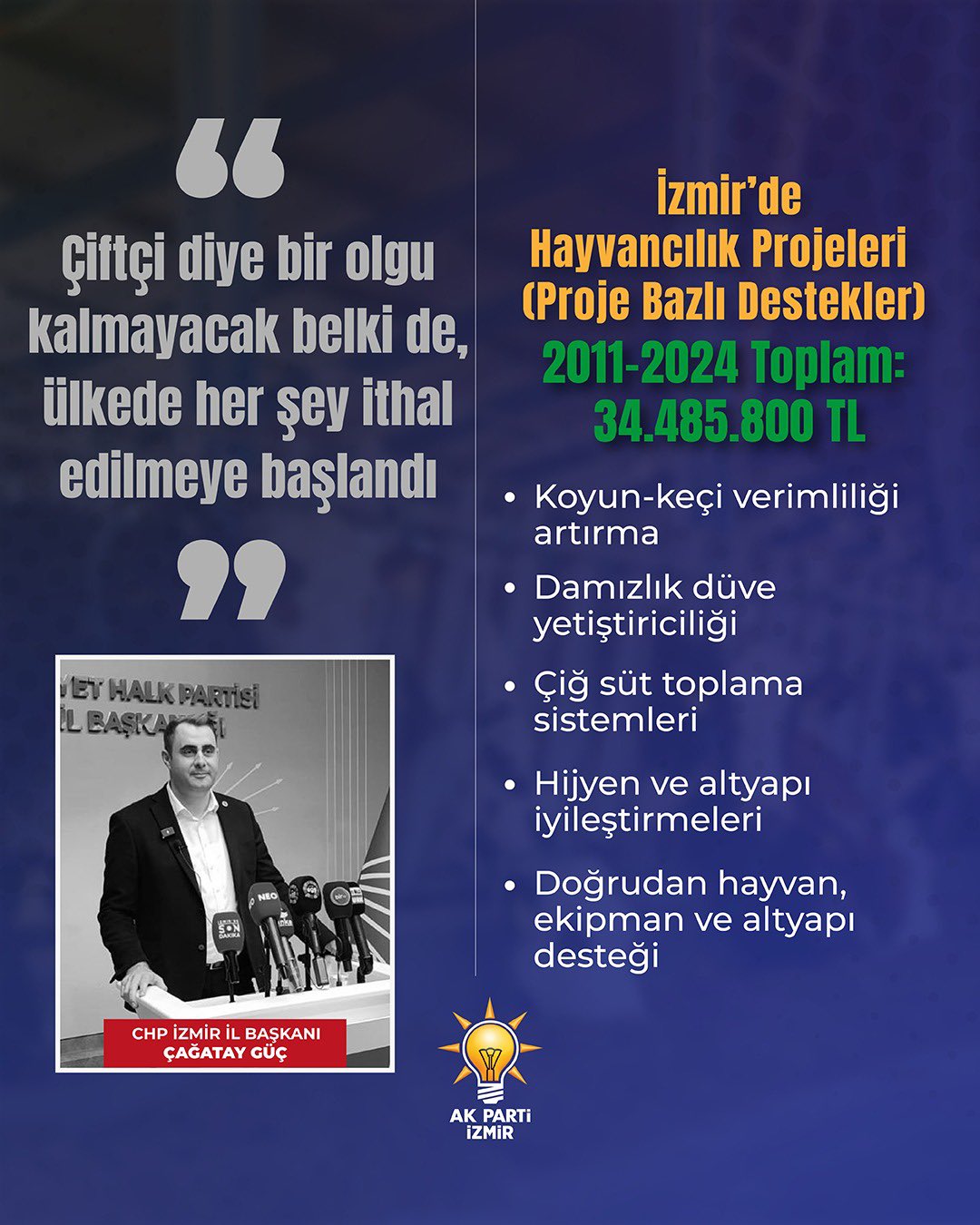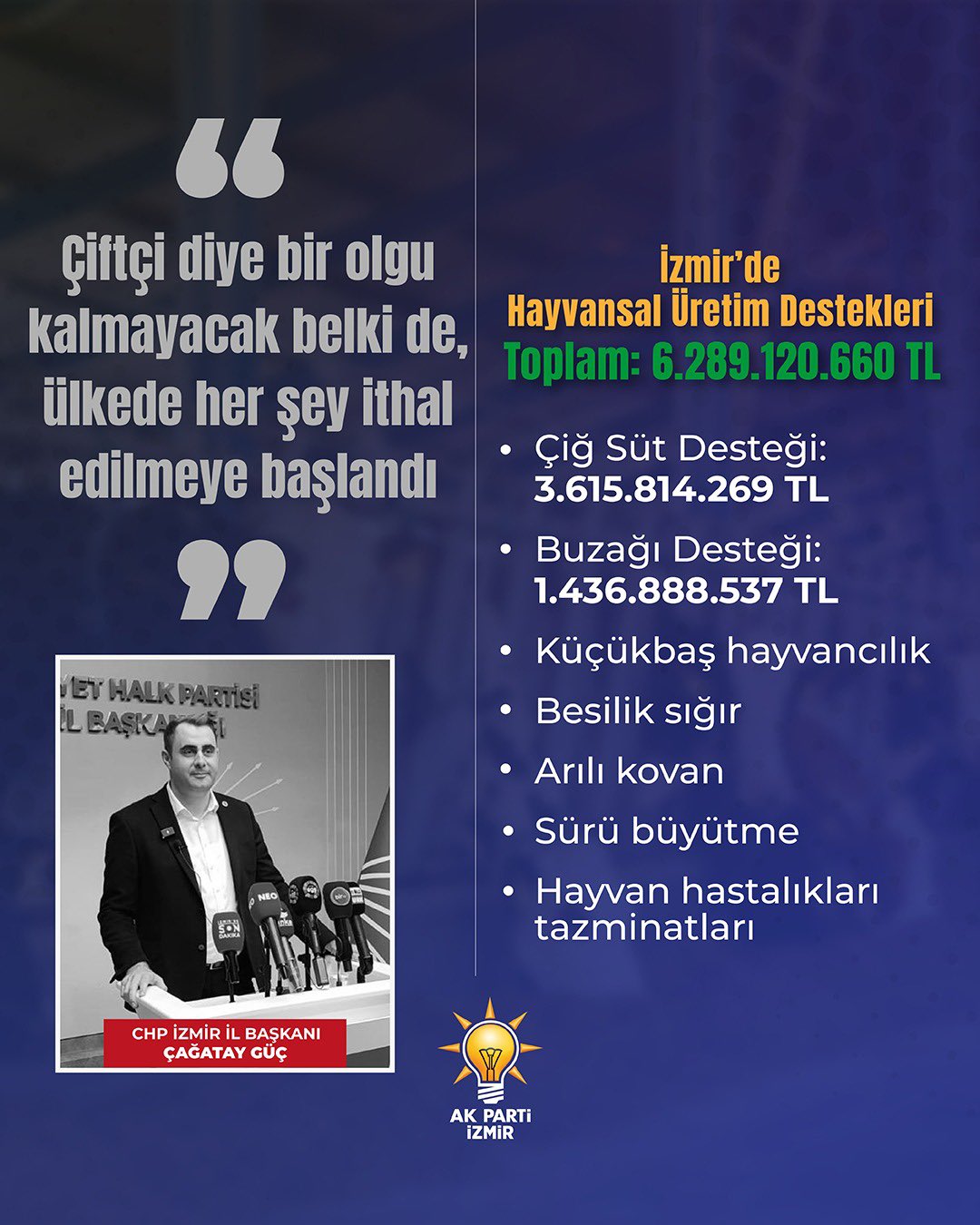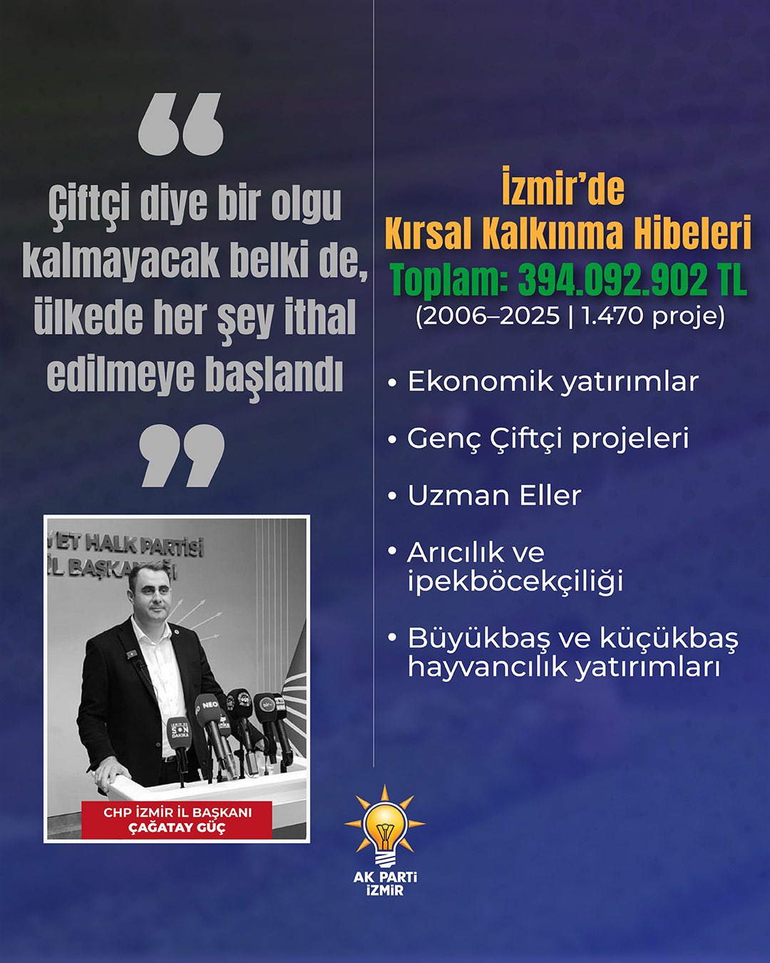 GERÇEKİZMİR - AK Parti İzmir İl Başkanı Bilal Saygılı, CHP İzmir İl Başkanı Çağatay Güç’ün İzmir’e yönelik yatırım eleştirilerine rakamlarla karşılık verdi. Saygılı, İzmir’de tarım, hayvancılık ve kırsal kalkınma başlıklarında yıllar içinde sağlanan destekleri kalem kalem açıkladı.