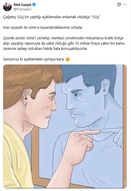 Saygılı sosyal medya hesabından yaptığı açıklamada paylaştığı görselle birlikte “Sanıyoruz ki açıklamaları aynaya karşı” dedi.