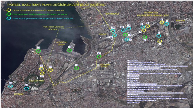İmar planlarının Alsancak Liman Arkası bölgesi, Yeni Kent Merkezi çevresi ve Bornova Kazımdirik Mahallesi gibi kentin rant odaklarında yoğunlaştığı belirtilen açıklamada, bu planları onaylayan kurumların ise Çevre ve Şehircilik Bakanlığı, Özelleştirme İdaresi, İzmir Büyükşehir Belediyesi, Bornova Belediyesi, Konak Belediyesi ve Bayraklı Belediyesi olduğu dile getirildi.