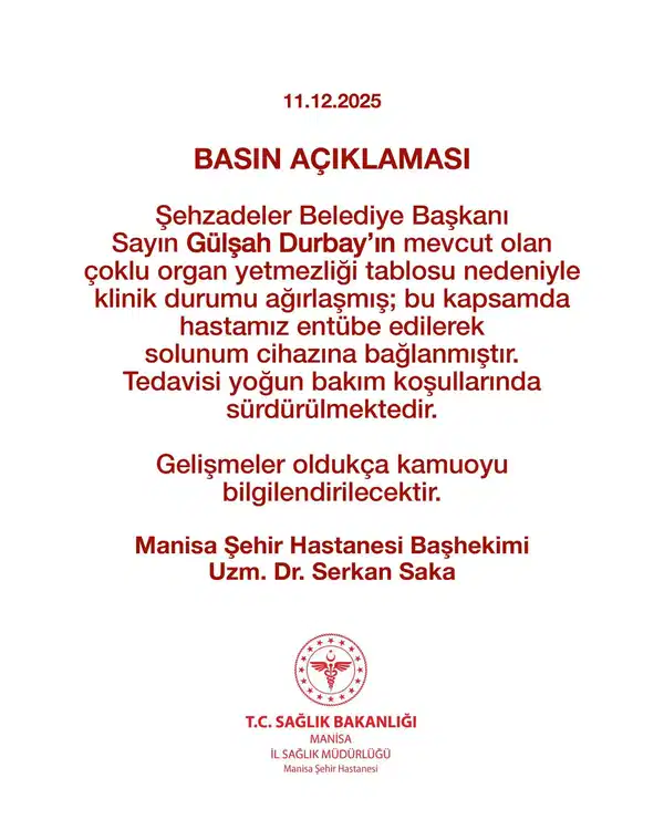 Manisa Şehir Hastanesi'nden yapılan açıklamada "Şehzadeler Belediye Başkanı Sayın Gülşah Durbay'ın mevcut olan çoklu organ yetmezliği tablosu nedeniyle klinik durumu ağırlaşmış, bu kapsamda hastamız entübe edilerek solunum cihazına bağlanmıştır. Tedavisi yoğun bakım koşullarında sürdürülmektedir. Gelişmeler oldukça kamuoyu bilgilendirilecektir" denildi.