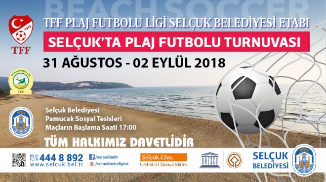 Türkiye Futbol Federasyonu Plaj Futbolu Ligi Selçuk Belediyesi Etabı 31 Ağustos Cuma günü saat 17.00’de Selçuk Belediyesi Pamucak Sosyal Tesisleri’nde başlayacak. Üç gün boyunca sürecek turnuvaya Efes Spor, Müze Spor, Selçuk Spor, Selçuk Gençlik Spor olmak üzere toplam dört takım katılacak. Toplam altı maçın yapılacağı turnuvada kazanan takım Alanya düzenlenecek olan Türkiye Plaj Futbolu Şampiyonası’nda ilçemizi temsil edecek.