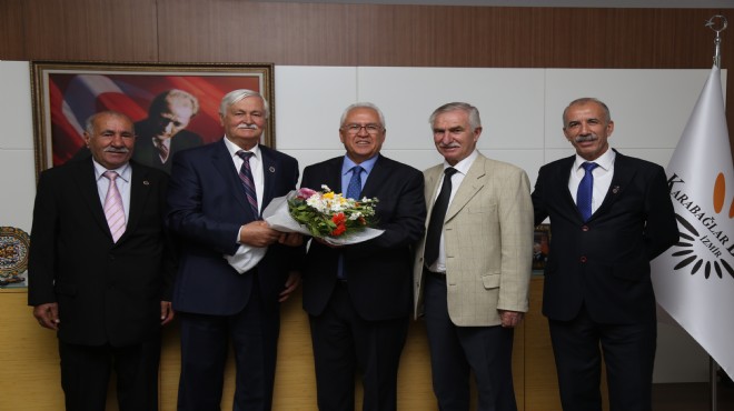 İzmir Muhtarlar Birliği Derneği Yönetim Kurulu Üyeleri, Karabağlar'daki 58 mahalle muhtarı adına Başkan Selvitopu'na çiçek sundular.