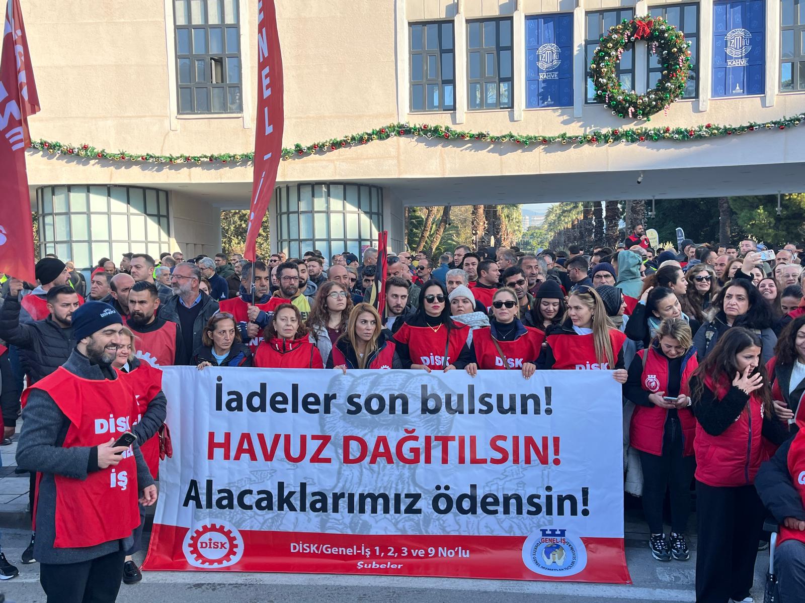 Asena TUNCA/GERÇEKİZMİR - Asena TUNCA/GERÇEKİZMİR - İzmir Büyükşehir Belediyesi şirketlerinde yaşanan ödeme krizi nedeniyle DİSK Genel İş Sendikası eylem takvimine devam ediyor.