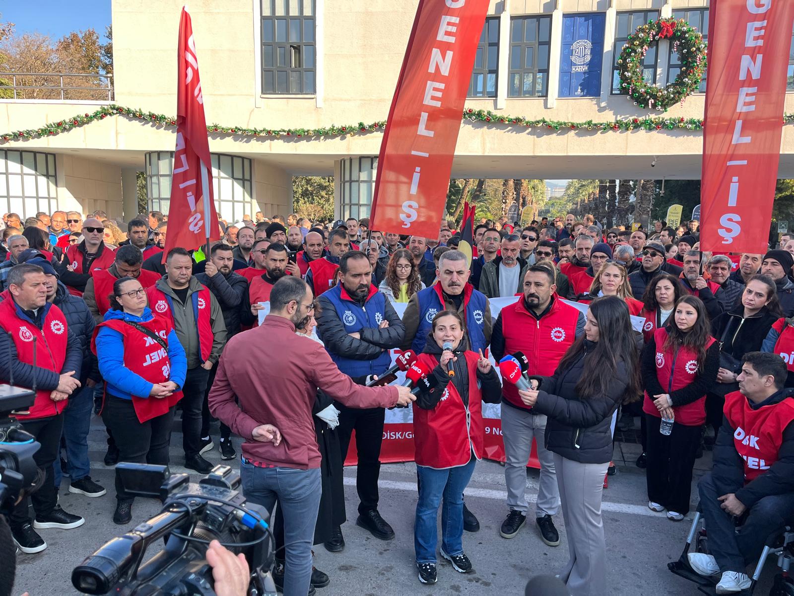 DİSK Genel İş 2 No'lu Şube Başkanı Ercan Gül şöyle konuştu: Tutanaklara, baskıya, tehdide boyun eğmeyen binlerce arkadaşımı selamlıyorum. Güne baskıyla başladık. 4 gündür ciddi anlamda baskı uygulanıyor. Katılım Cemil Başkan'a az gelmiş olabilir. Bütün İzmir bilsin ki baskı ve tehditle karşı karşıyayız ama buna boyun eğmedik. Bu sorunun ortadan kalkması için çözüm masasının kurulması lazım. Bir telefon bile yok.